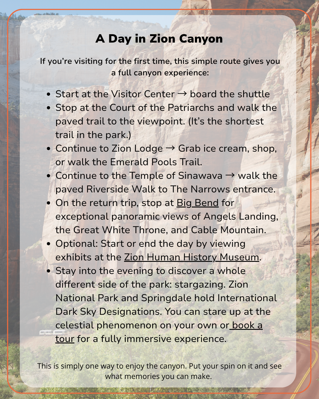 Trip Itinerary • 6 min read Explore the Heart of Zion National Park on the Zion Canyon Scenic Drive Zion Canyon Scenic Drive reveals Zion’s most iconic views—by shuttle or car—through a 7.7-mile route that changes with every season. Greater Zion April 3, 2026 The Zion Canyon Scenic Drive follows the Virgin River from the visitor center deep into the canyon, ending at the quiet stone amphitheater known as Temple of Sinawava. The drive itself can take less than half an hour without stops, but most visitors spend 2 to 4 hours exploring the route, hopping off at viewpoints, short trails, and scenic pullouts along the way. There’s one key detail that surprises visitors: you can’t always drive a private vehicle. During busier months, the park shuttle carries you along the drive. In quieter seasons, personal vehicles are allowed. How the Shuttle Works During most of the year, private vehicles are not allowed on the drive. You’ll need to park at the Zion Canyon Visitor Center, in the town of Springdale, or at the Zion Corridor Park & Ride. Then use the free park shuttle to access the canyon. The shuttle is a hop-on, hop-off system that runs through Zion Canyon. It allows you to explore trailheads and viewpoints at your own pace. Regardless of where you park, you will board the park shuttle at the Zion Canyon Visitor Center. What You’ll See Along the Way As the road winds deeper into the canyon, it connects you to some of the park’s most iconic places. A few of the stops to look forward to include: Court of the Patriarchs: short walk to a viewpoint of three massive peaks Zion Lodge: the central hub for food, restrooms, and access to the Emerald Pools Trail The Grotto for access to Angels Landing (Permit required for the chained portion.) Temple of Sinawava is the final stop and the start of the Riverside Walk to The Narrows Even if you never leave the shuttle or car, the drive reveals the scale and character of Zion National Park in a way everyone can appreciate. The same road. Four different experiences. Yes, this road delivers some of Zion Canyon’s most recognizable views, but what makes it remarkable is how it changes with the calendar. Spring (March–May) Mild temps (60s–70s), flowing water, and wildflowers returning to the canyon floor. Tips: One of the comfortable seasons to explore. Waterfalls and hanging gardens are often active, especially during the snow melt Shuttle system is in operation (no private vehicles in the canyon). Summer (June–September) Hot, bright, and full of long days. Best hiking windows: early morning or evening. Tips: Temps can reach near 100°F. Carry sun protection and plenty of water. Short afternoon thunderstorms are possible Shuttle runs frequently, but can have wait times Fall (October–November) Golden cottonwoods, cooler air, and some of the best hiking conditions of the year. Tips: Shuttle typically runs through late November (Thanksgiving) Fall color peaks late October – early November (varies yearly) Crowds slightly taper after Labor Day Winter (December–February) Quiet, reflective, and often lightly dusted with snow. Trails remain open unless conditions are icy or hazardous.** Tips: Private vehicles are often allowed in the canyon Shuttle runs during the holiday period (late December to early January) Always check the park’s official conditions page at nps.gov/zion. **The Riverside Walk, Pa’rus Trail, and Lower Emerald Pool Trail are all solid choices for winter hiking. They’re at a lower elevation, get more sun, and are less technical. Practical Tips Arrive Early Parking near the Visitor Center often fills by 8–9 a.m. Many people opt to park in Springdale and take the town shuttle. Pass Options To enter the park you will need a pass. Your options include: $35 Standard Pass This pass covers a single private vehicle for entry to national parks for 7 days only. The passengers in the car are all covered with this pass. If you drive a motorcycle into the park, it is a $30 fee for a standard pass. $80 Annual Pass The America the Beautiful pass covers all national parks and a variety of federal recreation lands across the country for one year for US residents. All passengers in the car are covered for entry. International travelers must purchase a Non-Resident Annual Pass. Take Your Time Pullouts and viewpoints are part of the experience, not detours. Watch for Wildlife Mule deer are common near the road; bighorn sheep sometimes appear on canyon walls; and California Condors soar over cliffs. Check Conditions Roads and trails can shift with the weather. Always check nps.gov/zion and Zion Area Roads to Recreation for current conditions before visiting. One Road: A Different Experience Every Season. The Zion Canyon Scenic Drive delivers something rare: a landscape that never feels the same twice. Whenever you arrive, it’s the perfect time to experience it. But don’t be surprised if, on the way out, you’re already planning your return. Do More Than Dream. Map Out Your Trip with Expert Resources. Request a Free Greater Zion Visitor Guide Tags: Drive through adventure explore Zion Canyon plan your Zion National Park trip scenic drive Zion Canyon Drive zion scenic loop shuttle Greater Zion